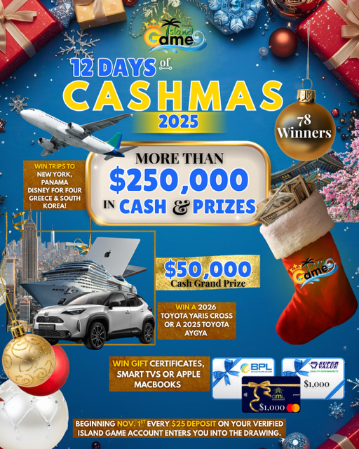 Promotion Dates: Beginning November 1st, 2025 How to enter: Starting on November 1st, every $25 deposit on your verified Island Game account enters you into the drawing. Promotion Payout: A total of more than $250,000 in cash and prizes will be given away to a total of 78 winners. Win trips to New York, Panama, Disney for four, Greece and South Korea. Win $50,000 Cash as Grand Prize. Win a 2026 Toyota Yaris Cross or a 2025 Toyota Aygya. Win Gift Certificates, Smart TVs or Apple MacBooks. "THE ISLAND GAME...WHERE DREAMS COME TRUE!"